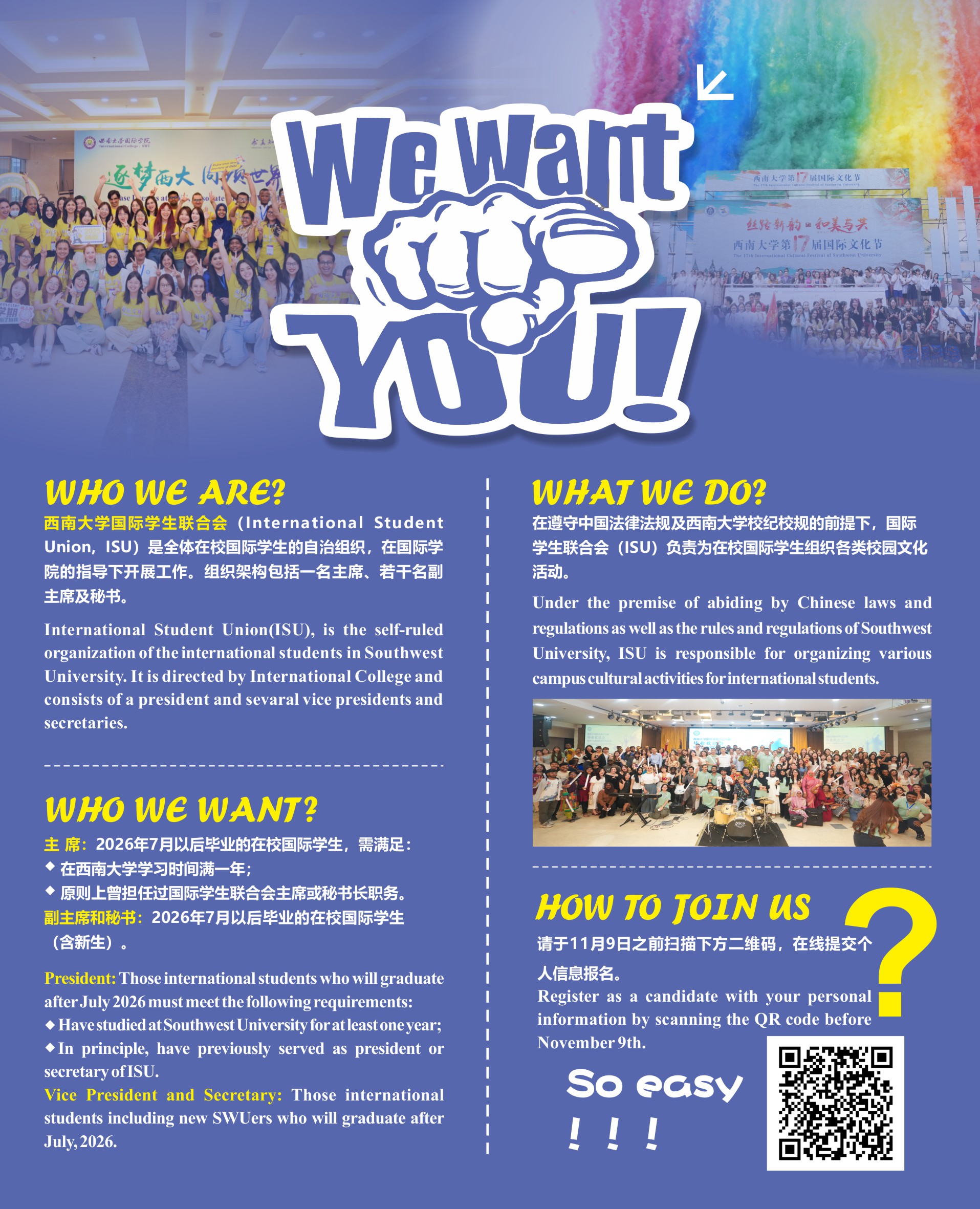 2025 Southwest University International Student Union (ISU) Recruitment is in Progress. You're WELCOMED to join us!!!